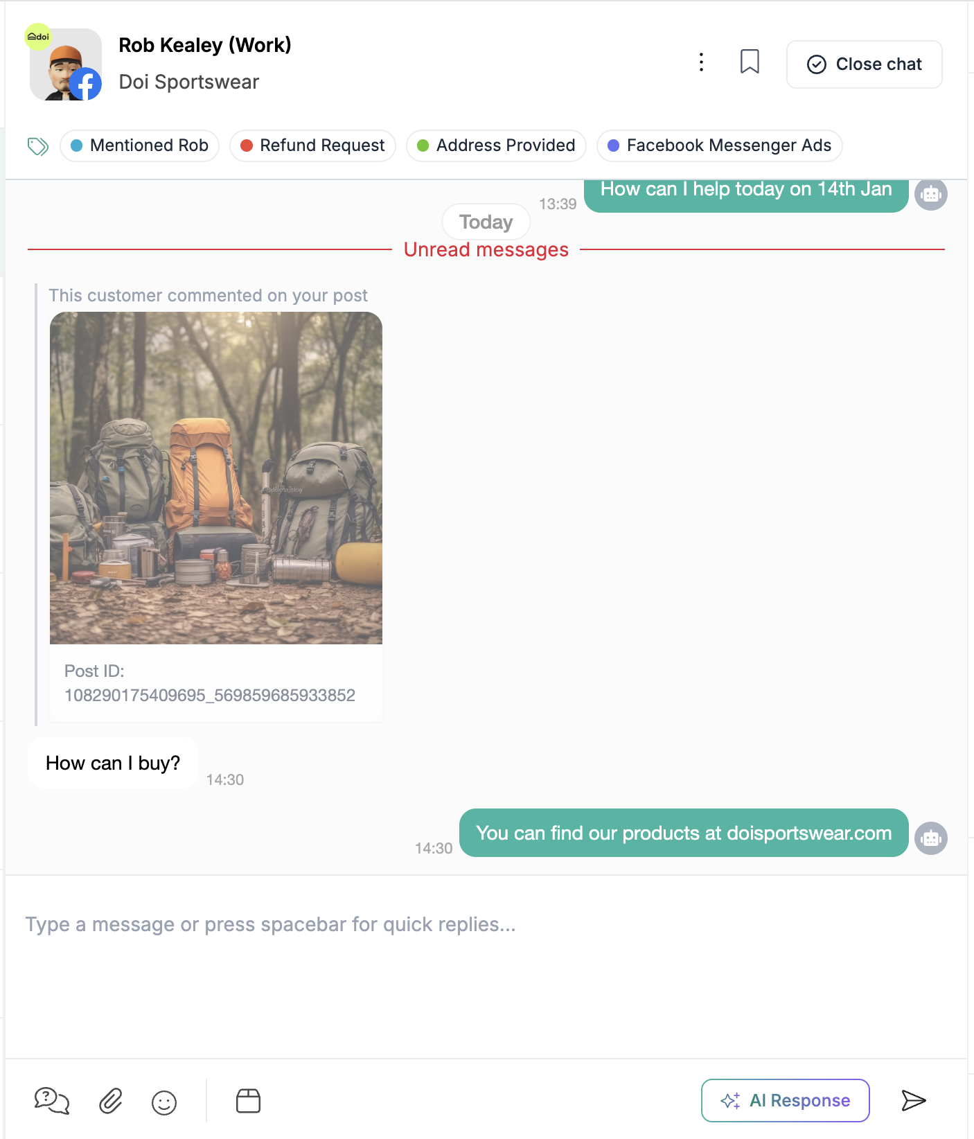 2. Note that due to Facebook rules, you will not be able to continue the conversation in Zaapi until the customer has sent another message