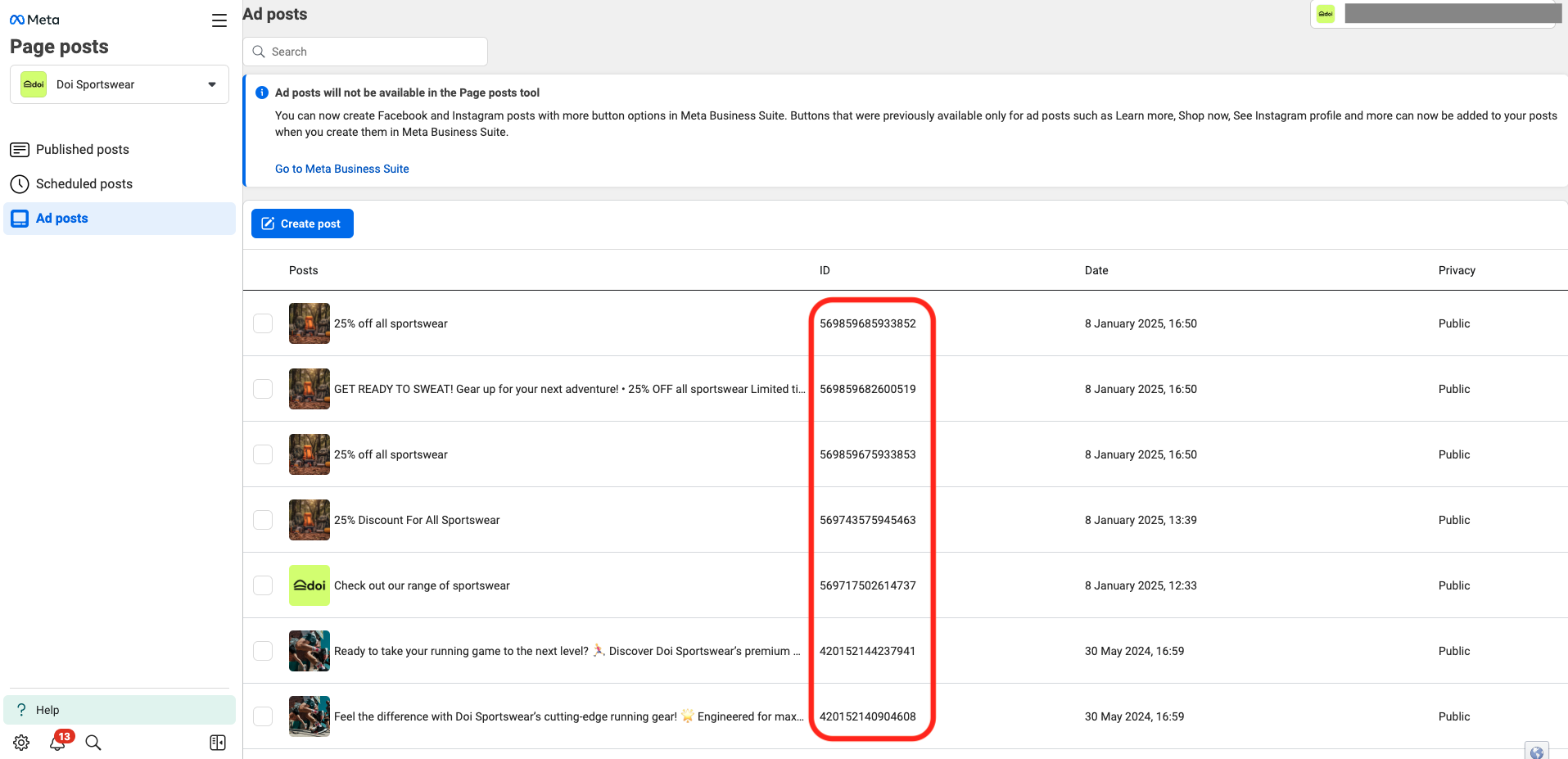 You can find the ad post ID in Business Suite. Go to **Meta Business Suite** → **All tools** → **Page posts** → **Ad posts**, as shown in the screenshot below: