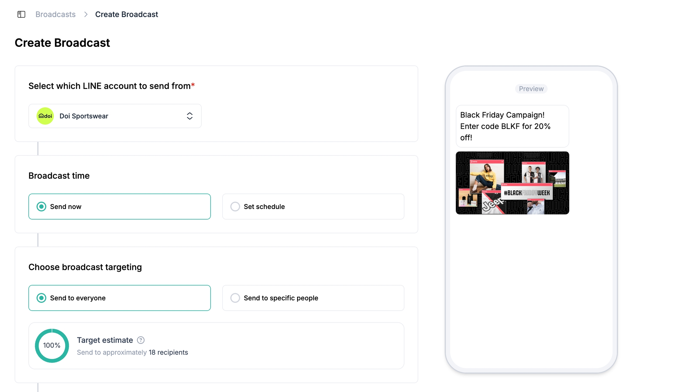 คลิก Create new broadcast เพื่อเริ่มสร้างแคมเปญใหม่
