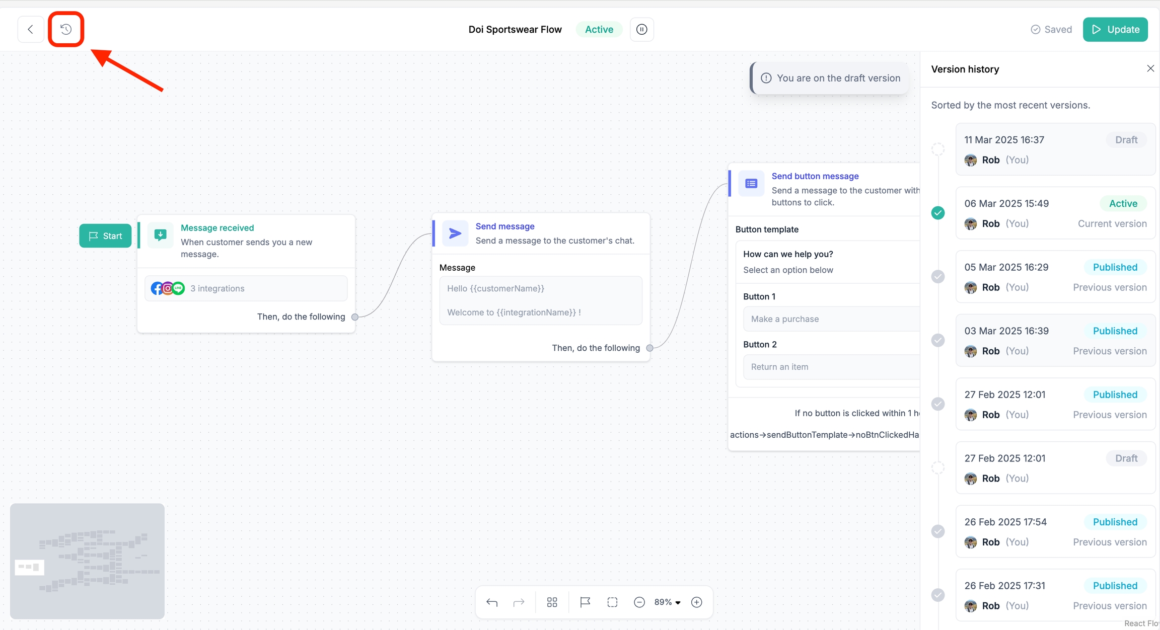 คลิกไอคอนมุมซ้ายบนเพื่อดู Version History และกู้คืนเวอร์ชันก่อนหน้าได้หากต้องการ