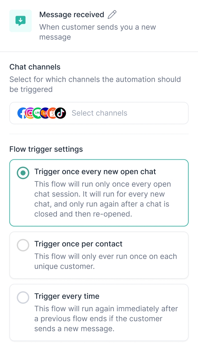 Trigger once per new open chat: ทำงานทุกครั้งที่เริ่มการสนทนาใหม่ (จะไม่ทำซ้ำจนกว่าจะมีแชทใหม่)