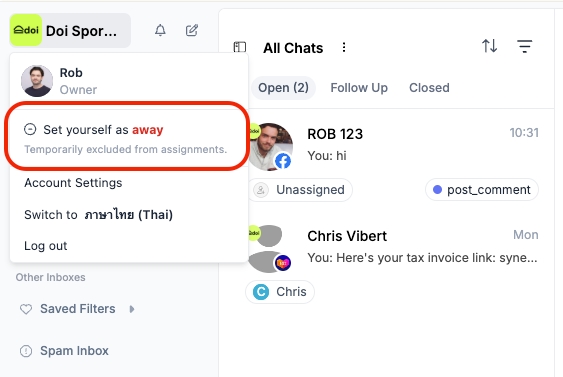 หมายเหตุสำคัญ: เมื่อต้องการกลับมารับแชทใหม่อีกครั้ง คุณต้องตั้งค่าสถานะกลับเป็น Active ด้วยตนเอง หากลืมเปลี่ยนกลับ คุณจะยังคงถูกตัดออกจากคิวมอบหมายแชทใหม่ต่อไป