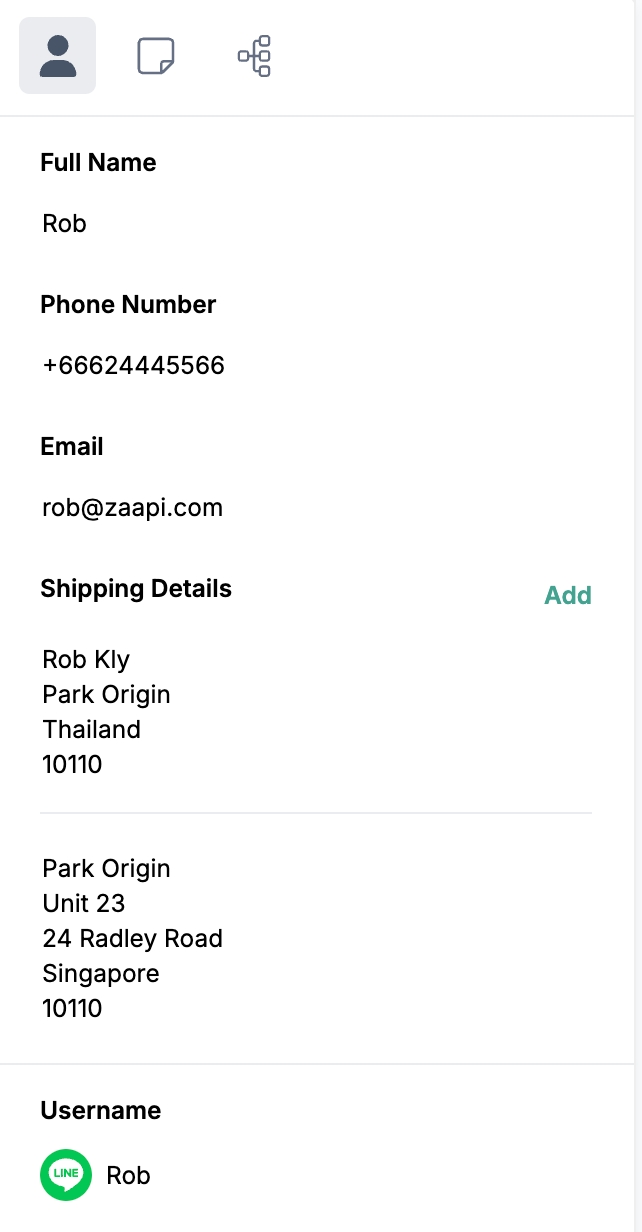 ชื่อผู้ใช้จริงจากช่องทางต้นทาง (เช่น Facebook, Instagram หรือ Line) จะยังคงแสดงอยู่ในส่วนนี้เพื่อใช้ในการอ้างอิง