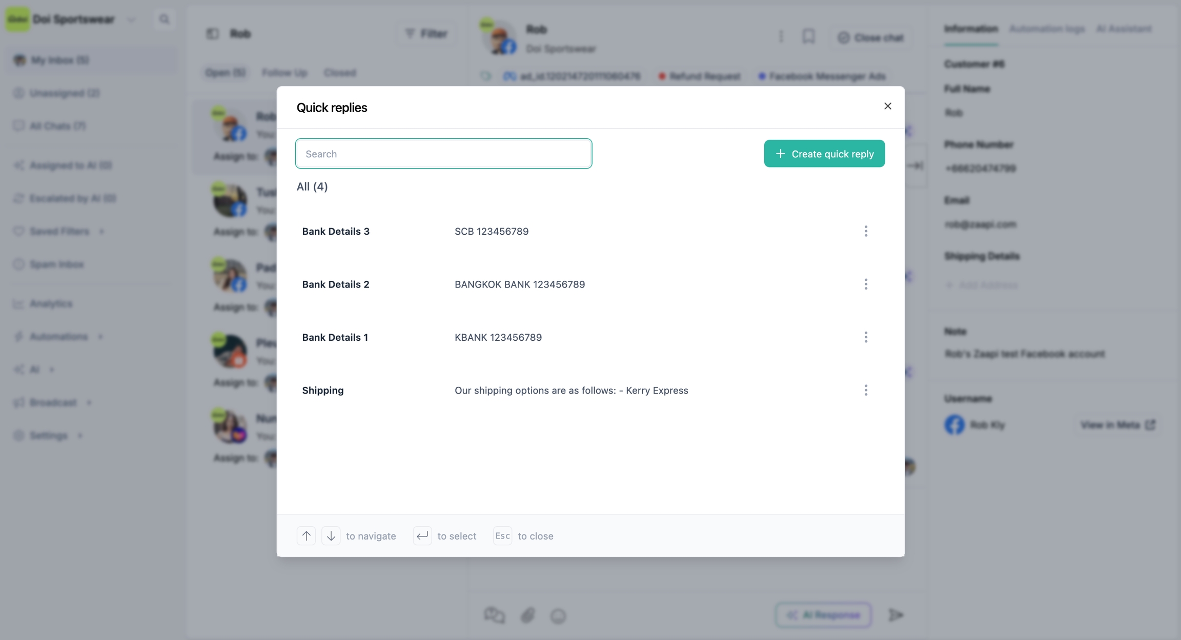 คุณสามารถเปิดรายการ Quick Replies ได้โดยคลิกที่ ไอคอน Quick Replies ด้านล่างของหน้าจอ จากหน้านี้ คุณยังสามารถแก้ไข ลบ หรือสร้างข้อความตอบกลับด่วนใหม่ได้เช่นกัน