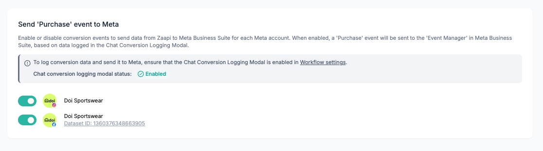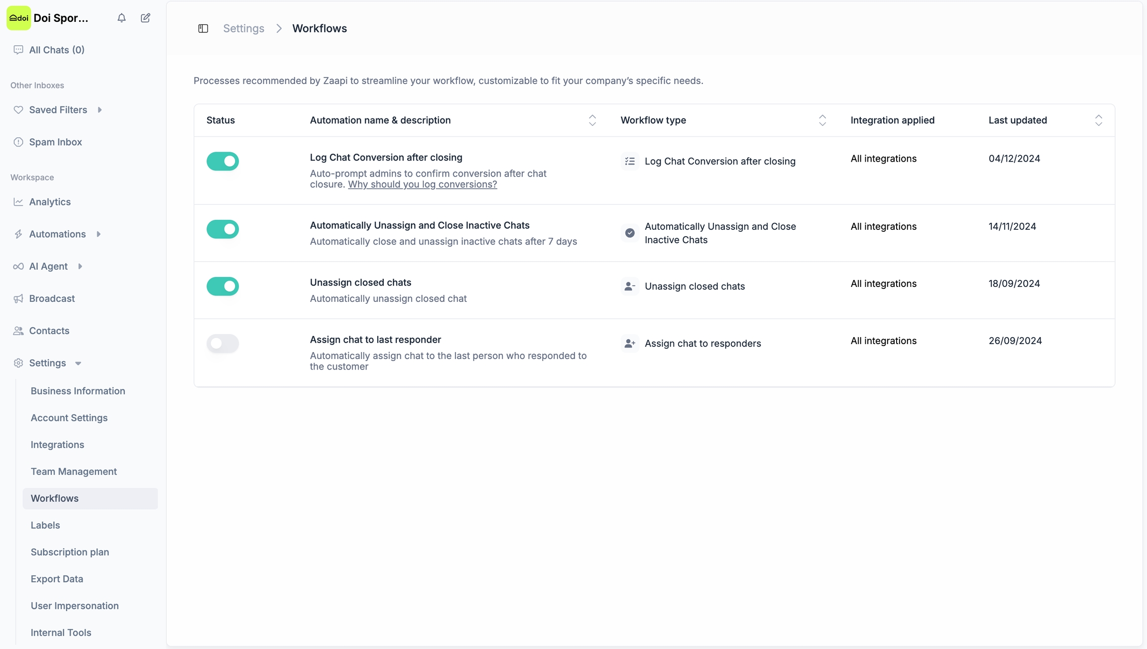 ไปที่แท็บ Workflows ในหน้า Settings ตรวจสอบให้แน่ใจว่า Workflow ชื่อ “Log Chat Conversion after closing” ถูกเปิดใช้งาน (“ON”)