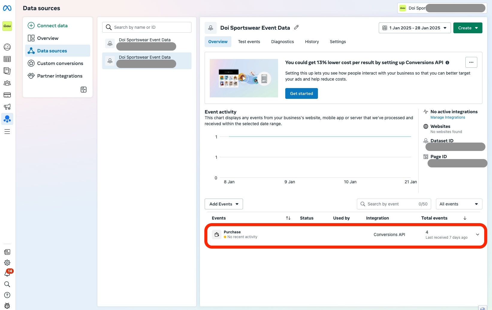 คลิก Dataset ID ของเพจที่คุณเพิ่งบันทึก Conversion