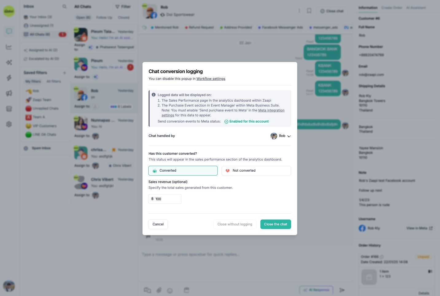 หมายเหตุ: Event “Purchase” จะถูกส่งไปยัง Meta เฉพาะการสนทนาที่ถูกปิด (Closed) และ บันทึกเป็น Conversion เท่านั้น