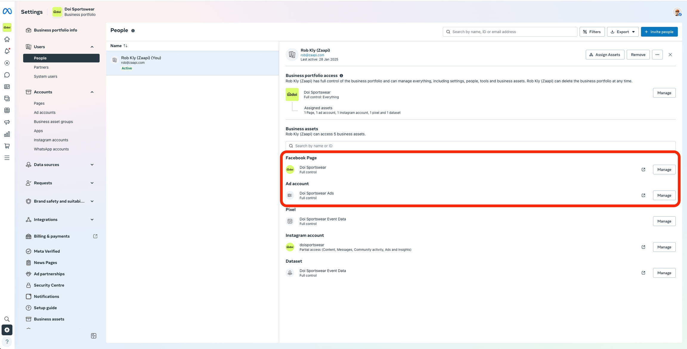 หมายเหตุ: ผู้ที่ทำการเชื่อมต่อ Facebook Pages ต้องมีสิทธิ์เป็น แอดมิน (Full Control) ทั้งในเพจและบัญชีโฆษณา (Ad Account) ที่ต้องการส่ง Conversion ไปยัง Meta สามารถตรวจสอบสิทธิ์ได้ใน Meta Business Suite โดยสิทธิ์ควรเป็นลักษณะดังนี้: