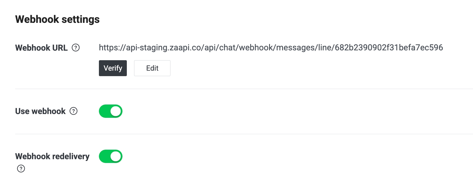 - กลับไปที่ LINE Developers Console และเปิดการทำงานของ webhooks และ webhook redelivery