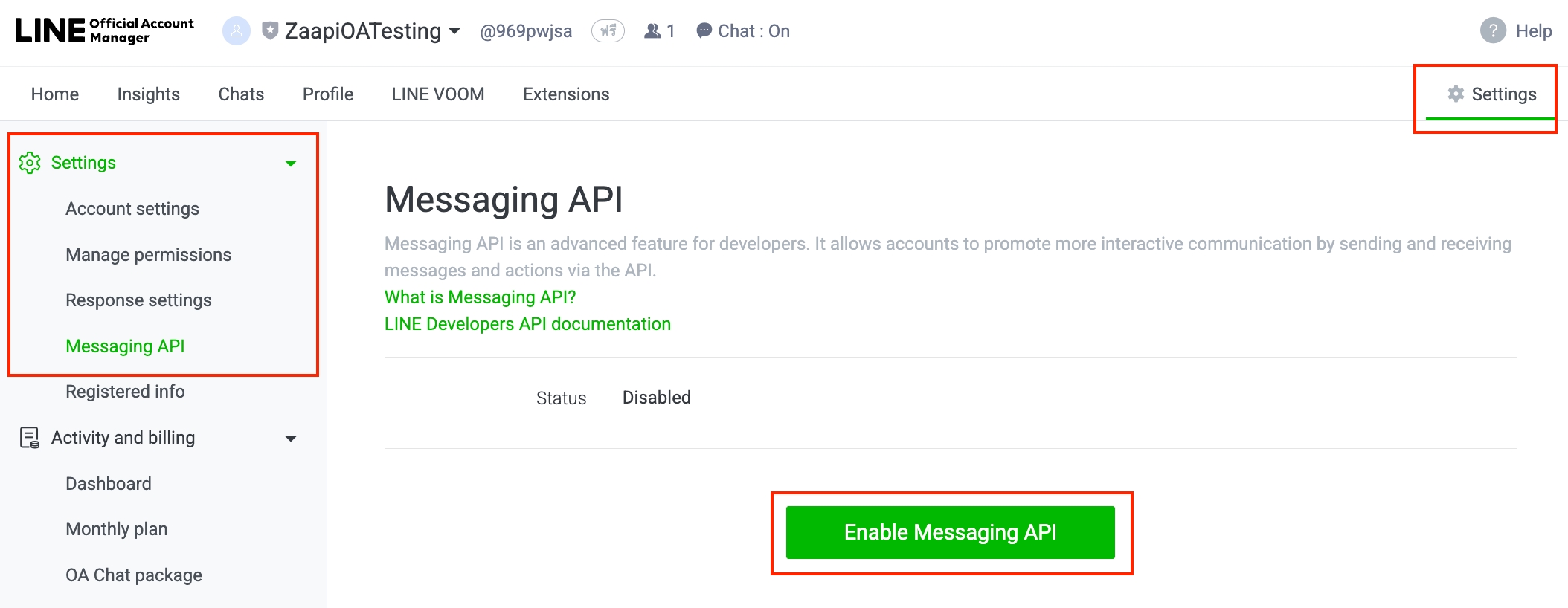 - ไปที่ การตั้งค่า (Settings) → Messaging API → เปิดใชง้าน Messaging API ของคณ