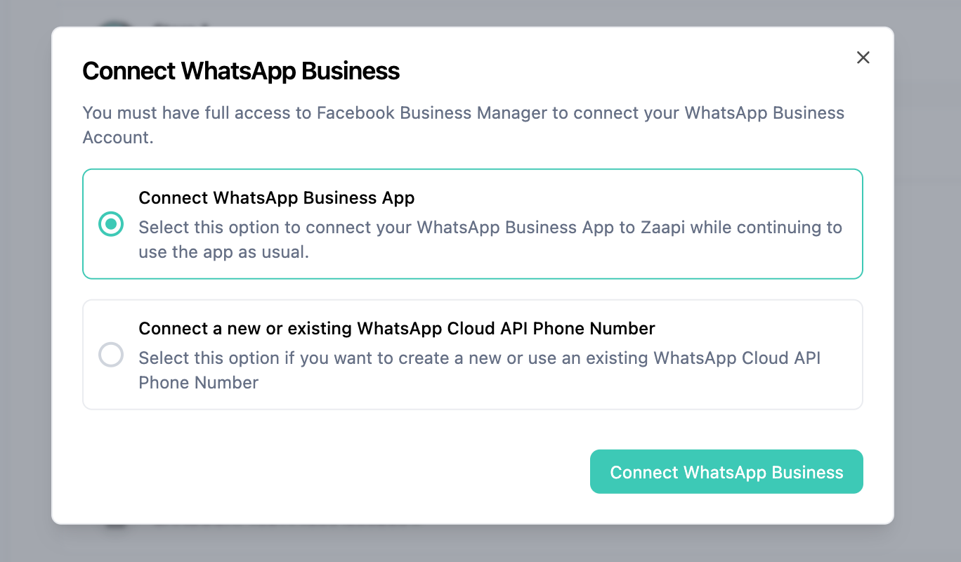 เชื่อมต่อแอป WhatsApp Business (Connect WhatsApp Business App) - หรือที่เรียกว่า "coexistence" ตัวเลือกนี้จะช่วยให้คุณสามารถใช้ทั้ง Zaapi และแอป WhatsApp Business ที่มีอยู่ของคุณได้