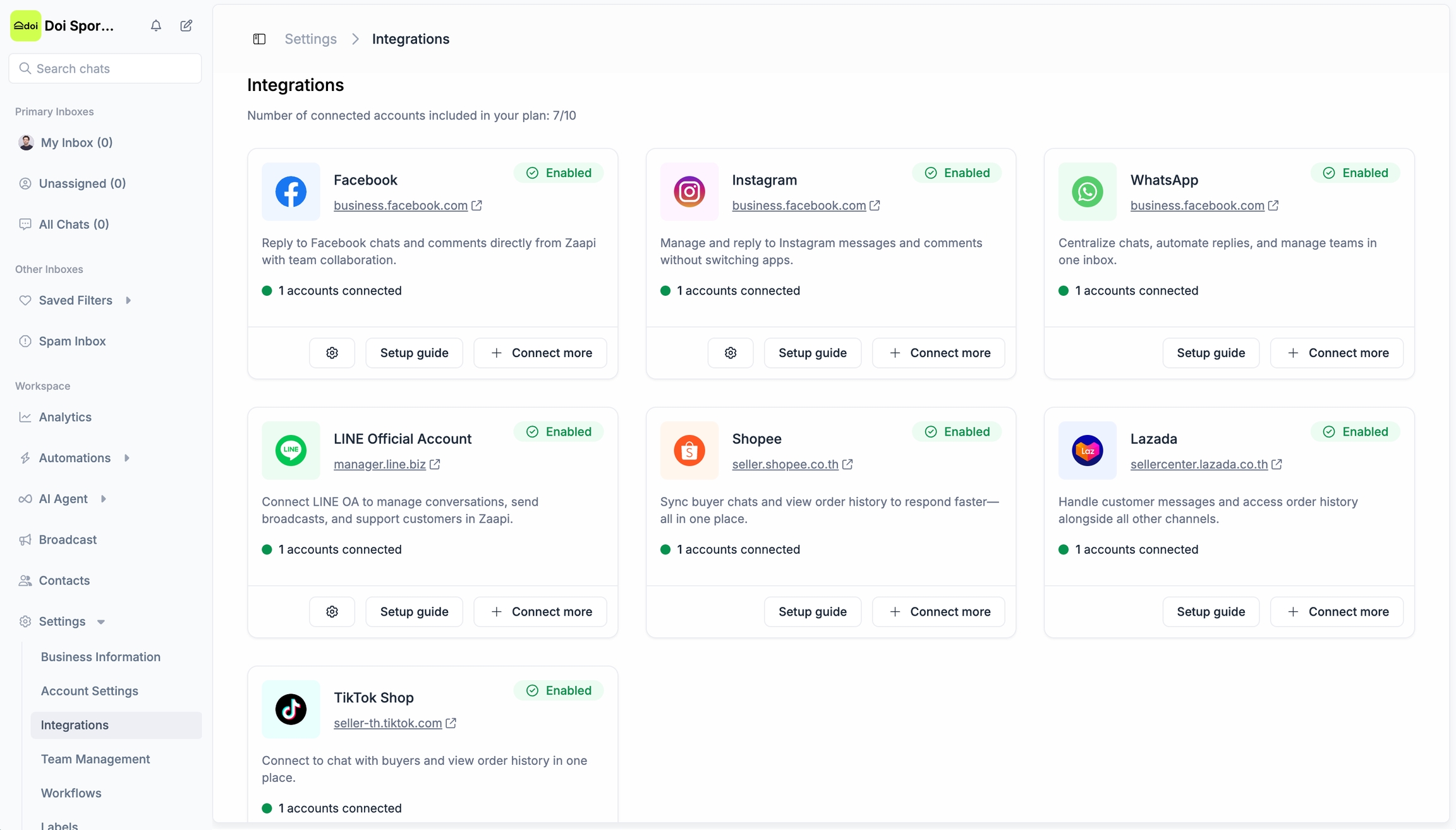 ถัดไป คุณจะต้องเชื่อมต่อช่องทางการส่งข้อความทั้งหมดของคุณเพื่อที่คุณจะสามารถเริ่มรับแชทในกล่องข้อความ Zaapi ของคุณได้ ในการทำเช่นนี้ ให้ไปที่ app.zaapi.com/th ไปที่หน้าการตั้งค่า (Settings) จากนั้นคลิกแท็บการเชื่อมต่อ (Integrations) จากที่นี่ คุณสามารถคลิกแต่ละช่องทางเพื่อเริ่มต้นได้